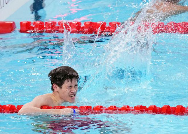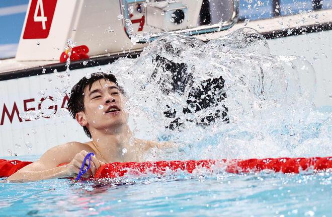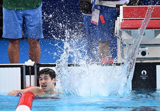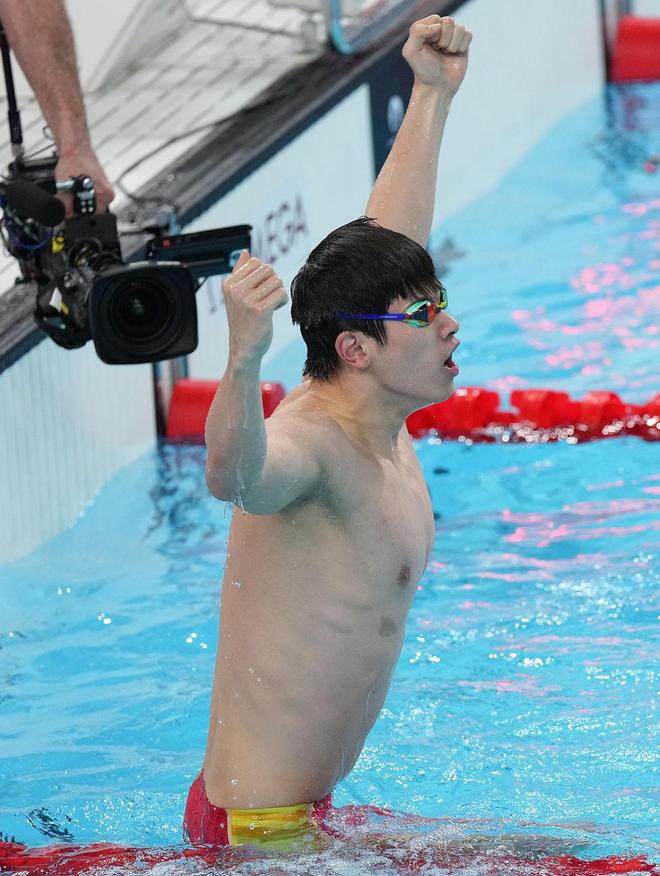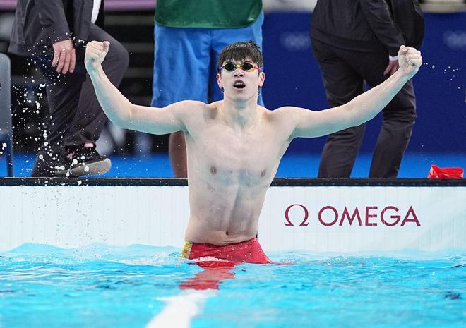 ↑中国选手潘展乐在比赛后庆祝。