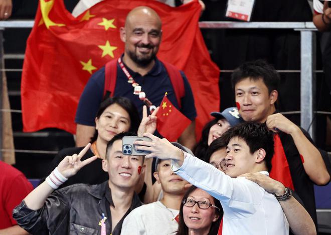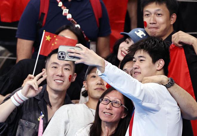 ↑中国选手潘展乐(右一)在颁奖仪式后与观众合影。新华社记者 雒圆 摄