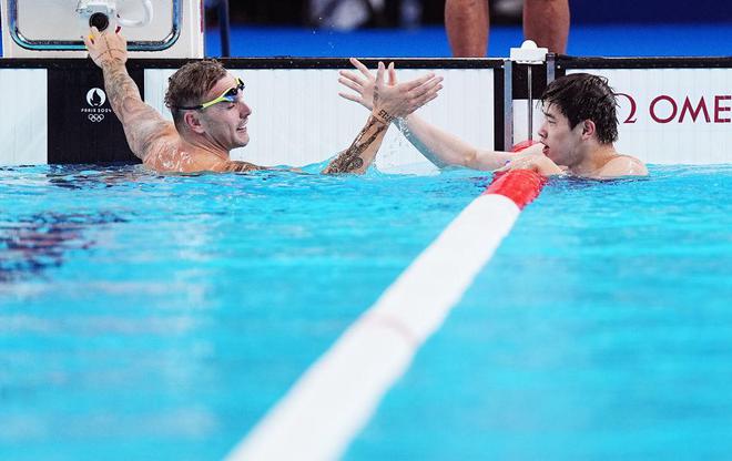 ↑中国选手潘展乐(右)与亚军澳大利亚选手查默斯在比赛后庆祝。