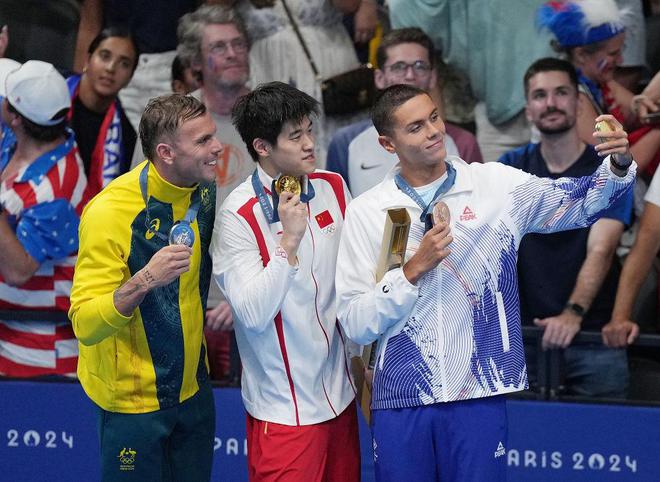↑冠军中国选手潘展乐(中)、亚军澳大利亚选手查默斯(左)与季军罗马尼亚选手波波维奇在颁奖仪式后。新华社记者 雒圆 摄