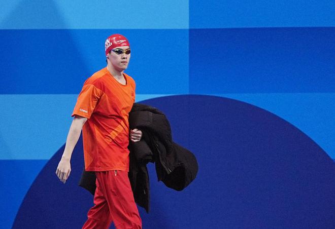 ↑中国选手潘展乐在比赛前入场。